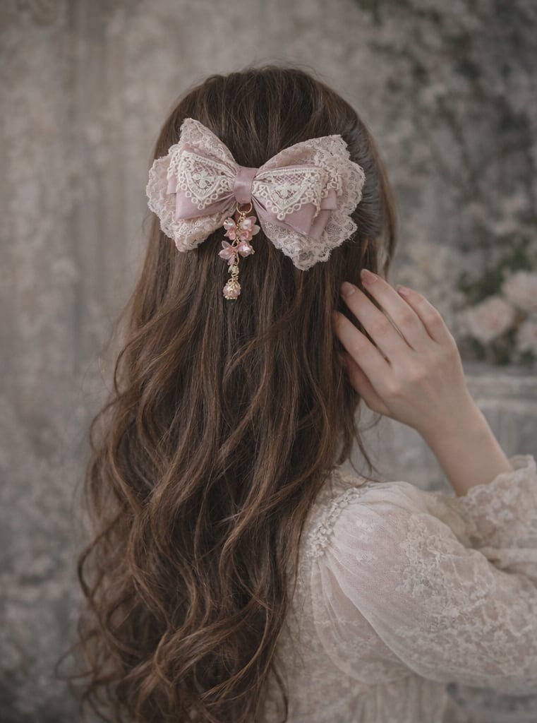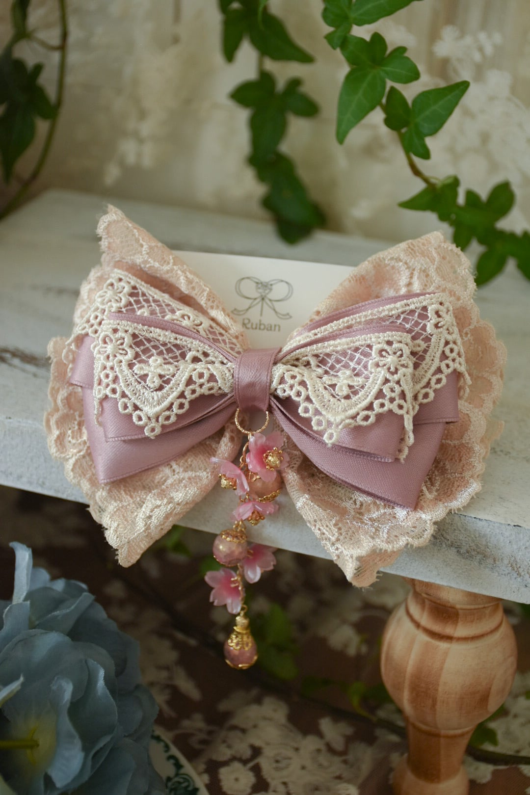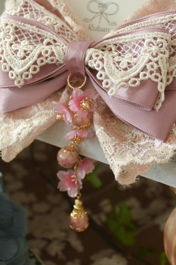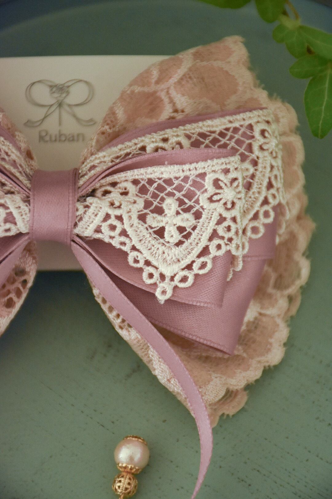 やさしい桜色のレースとリボンを重ね、